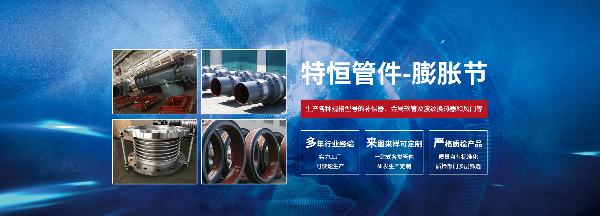 泰州市特恒管件有限公司坐落于風景如畫的江蘇省泰州市,是專業從事設計、生產金屬、非金屬膨脹節、橡膠補償器、不銹鋼金屬軟管、風門等的廠家。公司擁有各種先進生產、加工、檢測設備和強大的技術力量支持。我公司根據國內先進的加工成型工藝、科學的管理體制、先進的工裝設備不斷充實、完善質量保證體系,從而創造出高品質的產品。聚科技精英、出優質精品、品質卓越、信譽至上是我們的不懈追求。我公司愿以可靠的質量和良好的信譽,“誠信、公正、求實、創新”的經營理念與廣大用戶攜手合作,共創美好未來。我公司采用先進的標準進行設計、生產各種規格型號的補償器、金屬軟管及波紋換熱器和風門等。廣泛應用于電子、電力、核電、石化、冶金、儀表、儀器、航天、航 空、船舶、碼頭、建筑、食品、供熱等行業,曾先后為多家大型企業提供各種型號的優質補償器,產品遠銷國內外。我公司擁有一批專業技術人員和優秀的售后服務人員,以確??蛻粼谶x型號以及客戶在產品安裝、運行中出現問題時可以得到及時、專業、有效的處理,并為客戶在設計、安裝、運行中提供專業的技術指導。